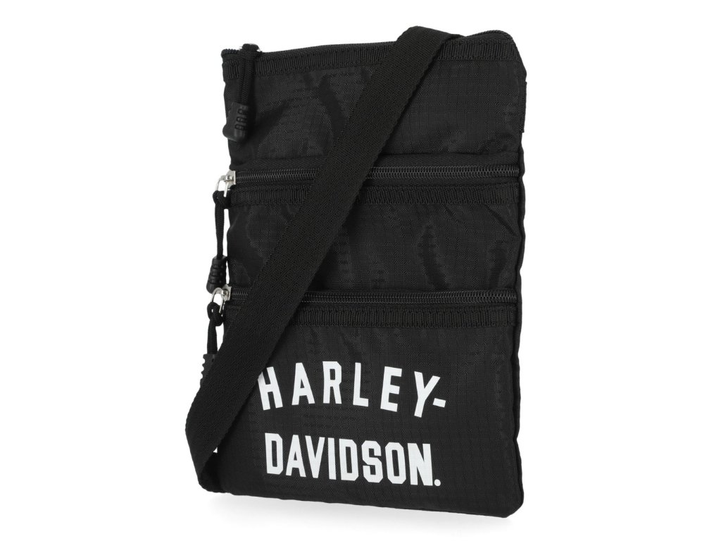 Praktická textilná crossbody taška s kontrastným nápisom Harley-Davidson® a nastaviteľnou dĺžkou upínania. Taška má odkladacie vrecká na zips. Materiál: 100% polyester Rozmer: šírka 18 cm, výška 23 cm.
