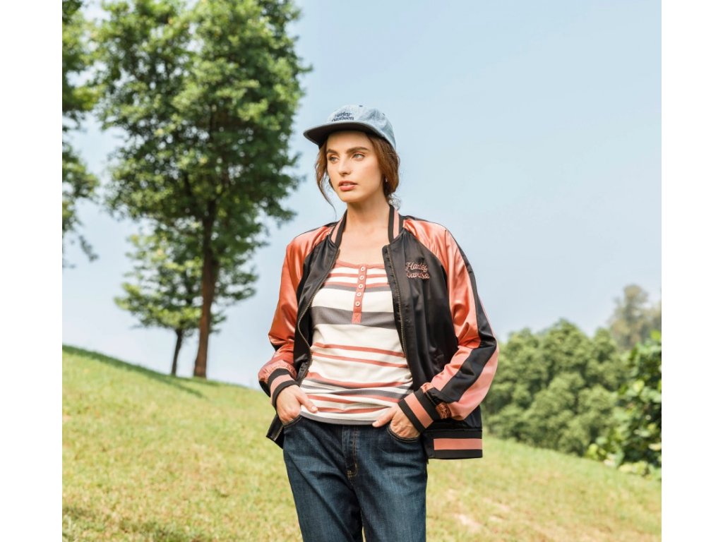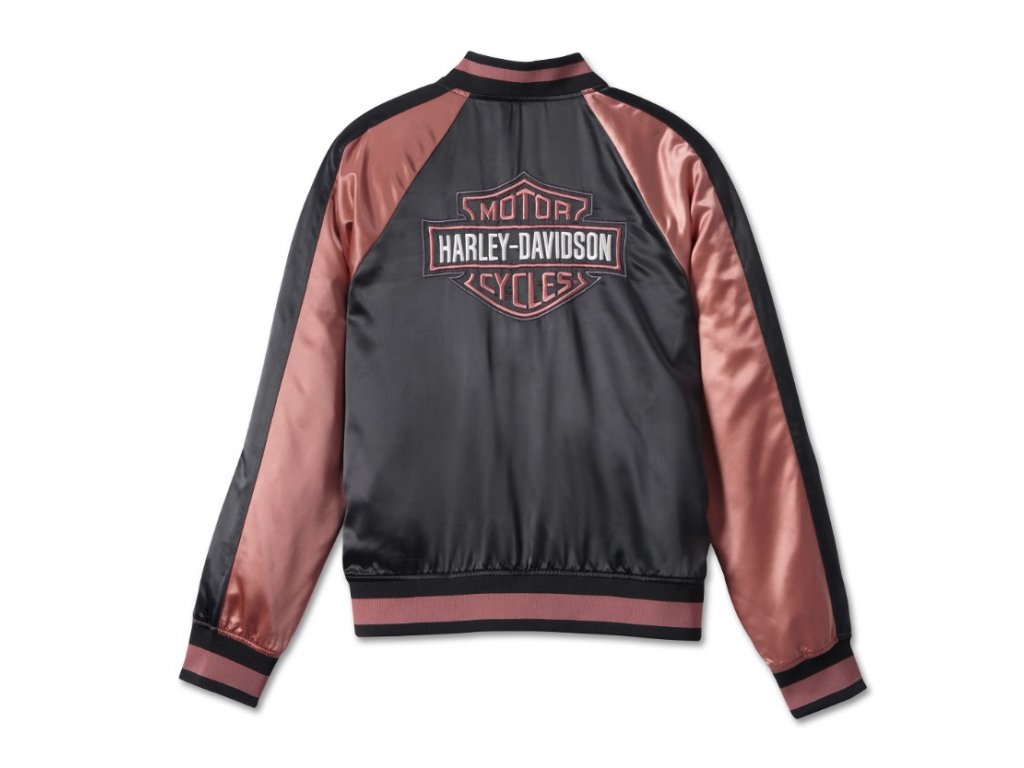 Vráťte sa v čase z touto ľahkou dámskou saténovou bomber bundou s logom Harley-Davidson® Classic Bar & Shield, v staroružovej farbe. Body za štýl získava aj za farebné rukávy, výrazné pruhy a atraktívne vyšívane logo Harley-Davidson® vzadu. Vyrobená zo 100% saténového polyesteru, 100% polyesterová keprová podšívka. Golier, manžety a pás z rebrovaného úpletu. Vrecka na ohriatie rúk na cvoky.Diskusia