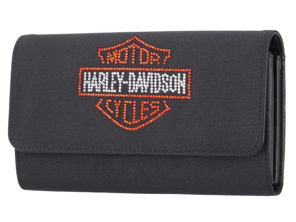 Dámska textilná peňaženka s kamienkovým logom Harley-Davidson® Bar & Shield a zatváracou chlopňou. Vyrobená z odolného polyesteru. Zapínanie na patentný cvok. Vnútorné prvky: priehradky na kreditné karty, vrecko na zips, dvojité vrecká na zasúvanie. Vonkajšie zadné vrecko na zips. Rozmery 19,9 cm x 10,5 cm x 2,5 cm.Buďte prvý, kto napíše príspevok k tejto položke.
