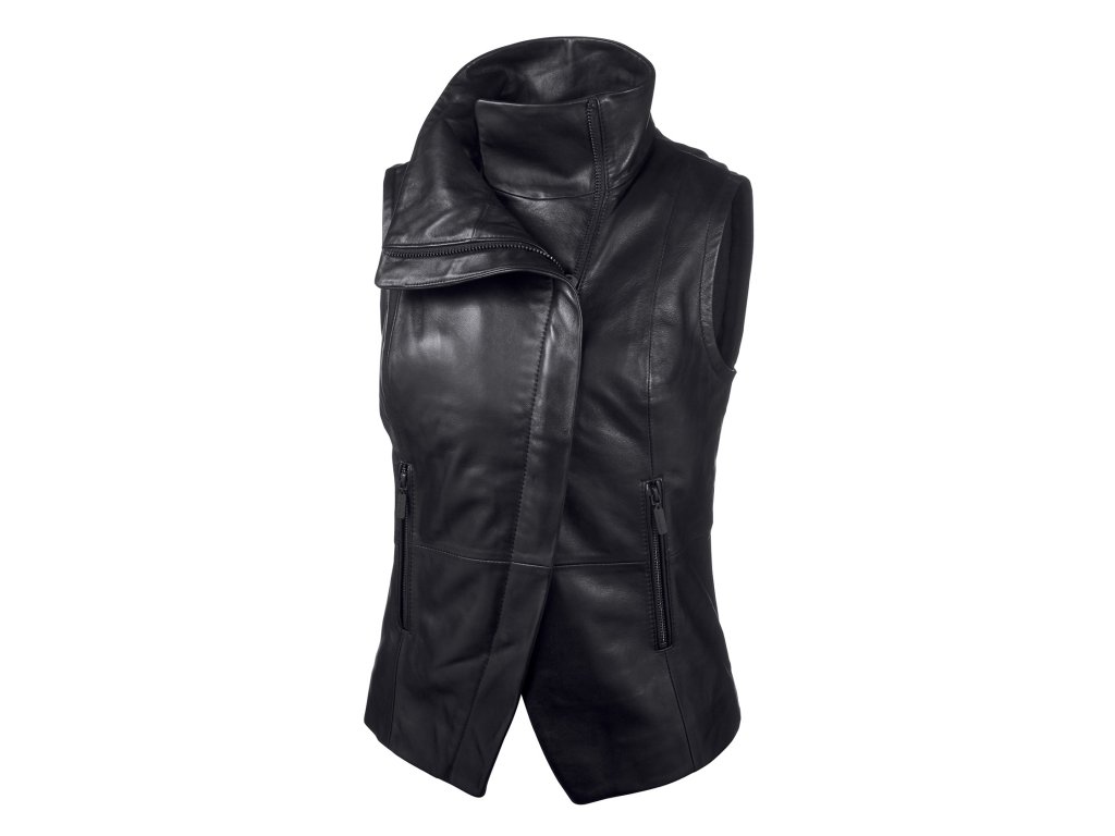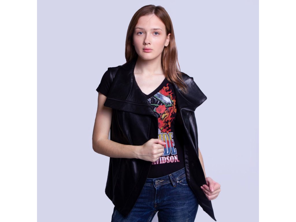 Dámska vesta z jemnej jahňacej kože s vysokým golierom. Vesta má zapínanie "krivák" na zips, bočné skryté vrecká so zapínaním na zips. Chrbtový panel s elastického pevného úpletu obopne postavu. Jemné vyšívané Bar&Shield logo Harley-Davidson® vzadu na chrbte. Farba: čierna Materiál: predný diel - jahňacia koža, zadný diel - 86% nylon, 14% spandexBuďte prvý, kto napíše príspevok k tejto položke.