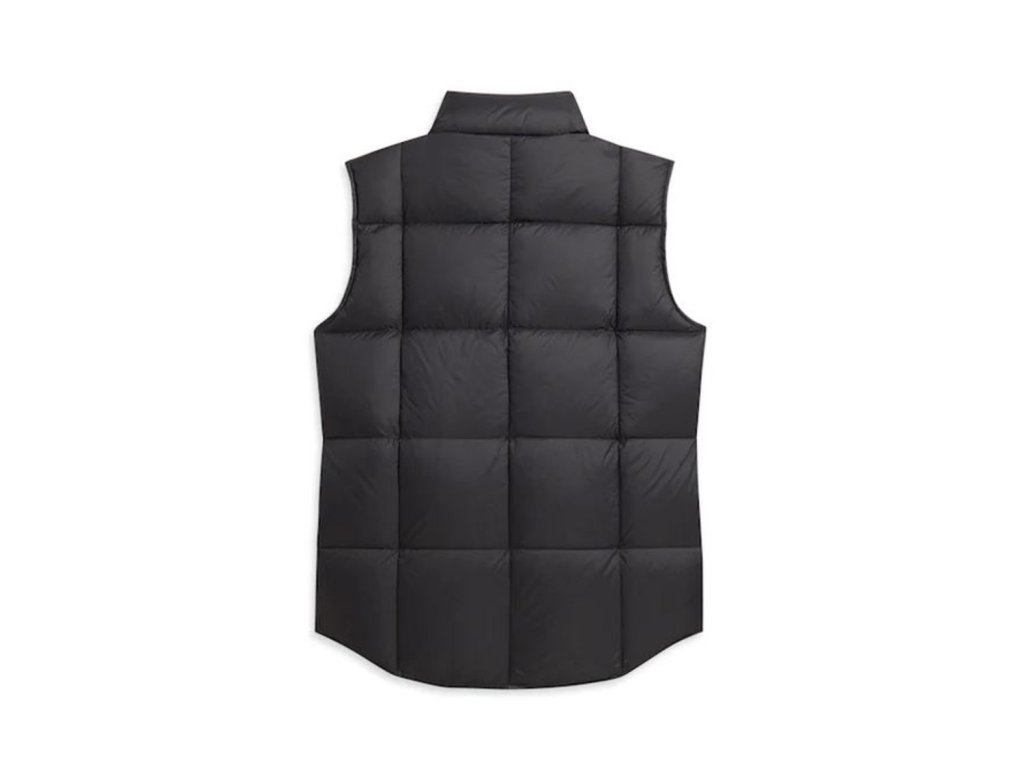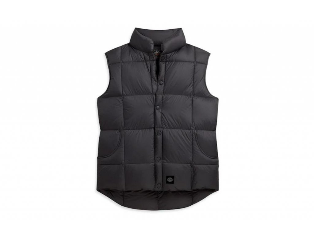 Dámska zimná vesta puffer s károvaným prešívaným vzorom a zapínaním na patenty. Vzadu mierne predĺžená a vpredu vľavo dole malá textilná vysačka Harley-Davidson®. Farba: čierna Materiál: Nylonový taftDiskusia