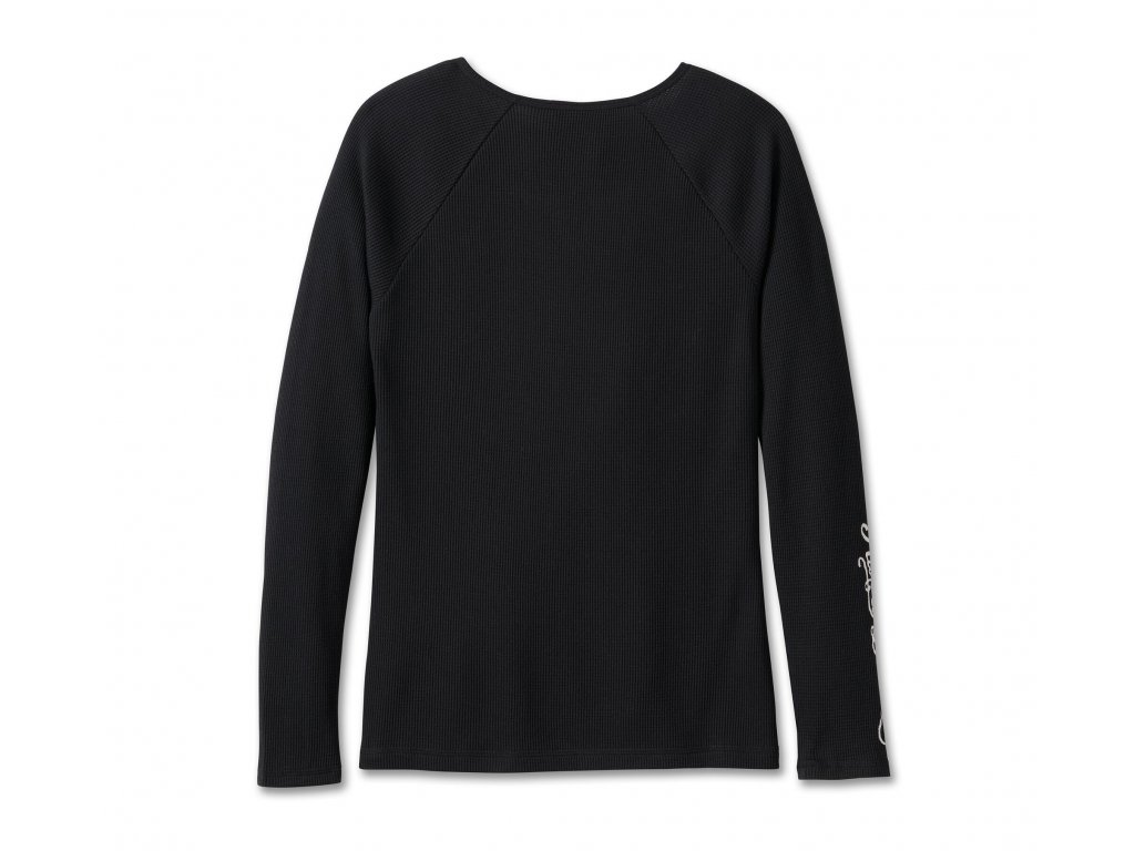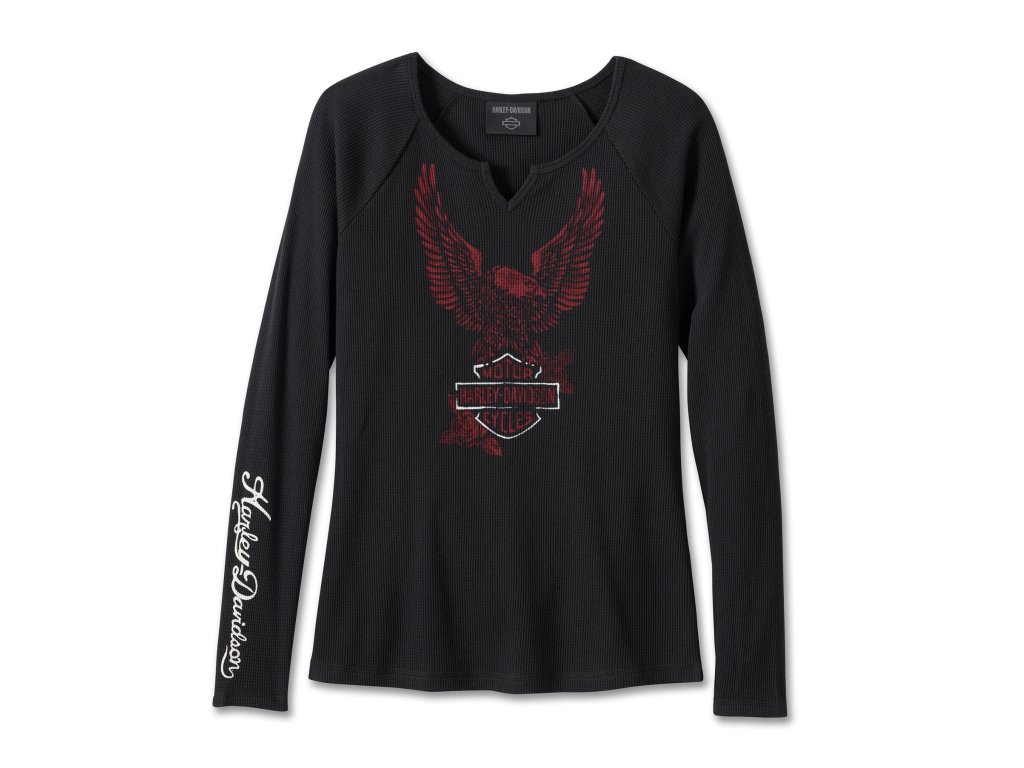 Dámske tričko z thermal úpletu s dlhými raglán rukávmi a s potlačenou grafikou orla Harley-Davidson® na hrudi a kontrastnou potlačou nápisu Harley-Davidson® na pravom rukáve. farba: čierna Materiál: 60% bavlna, 40% thermal polyester