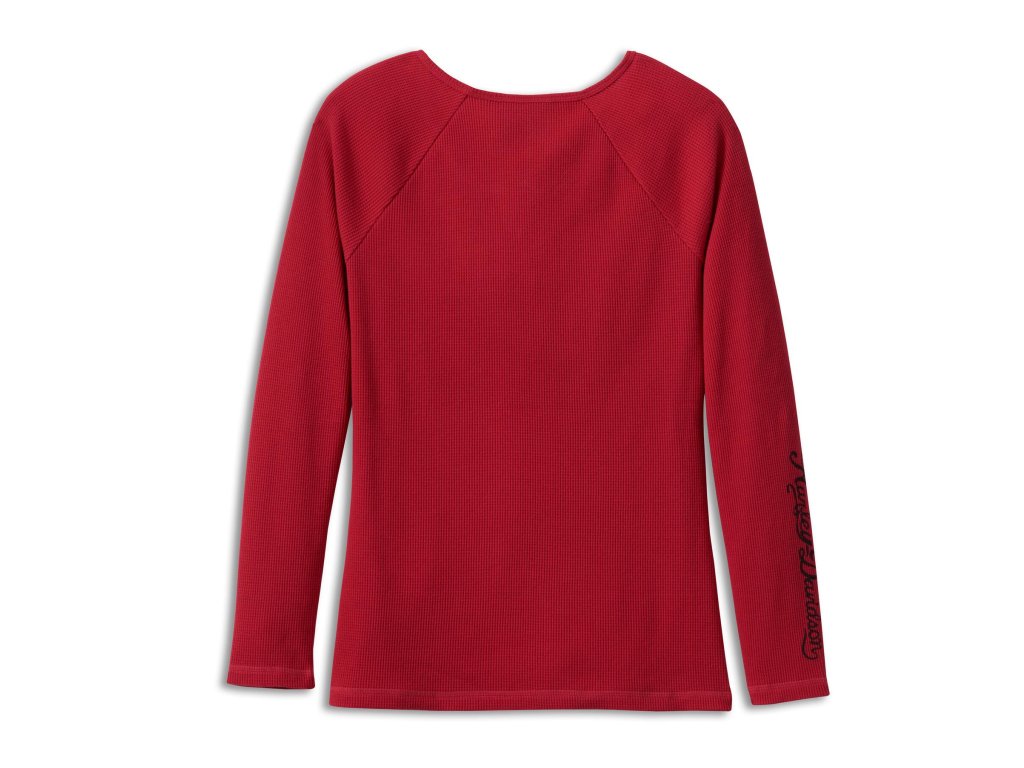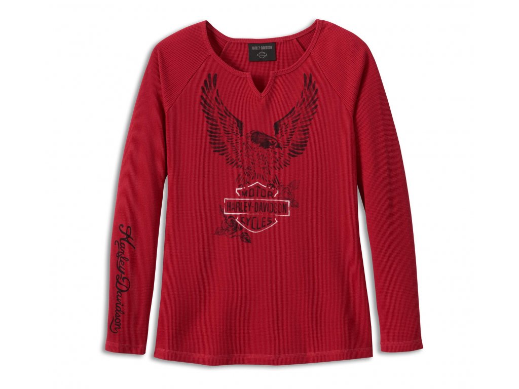 Dámske tričko z thermal úpletu s dlhými raglán rukávmi a s potlačenou grafikou orla Harley-Davidson® na hrudi a kontrastnou potlačou nápisu Harley-Davidson® na pravom rukáve. farba: červená Materiál: 60% bavlna, 40% thermal polyester