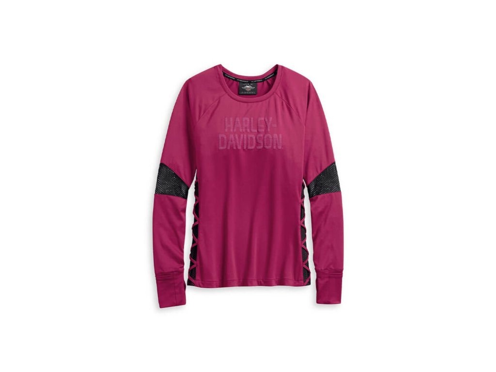 Dámske funkčné tričko s dlhým rukávom a ozdobným šnurovaním po bokoch. Embosovaný nápisHarley-Davidson® potlačený vpredu. Vďaka priedušnej textílii a sieťovinovým vetracím bočným panelom a panelom na lakťoch je tričko priedušné, rýchlo schne a má chladivý efekt. Materiál: tričko 92% polyester, 8% spandex; sieťka 82% nylon, 18% spandex.Diskusia