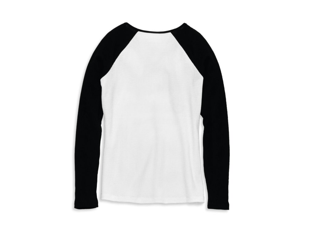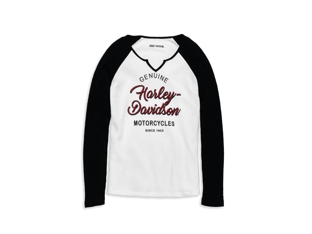 Dámske tričko z wafflového úpletu s dlhým raglánovým rukávom a V výstrihom. Kontrastné logo Harley-Davidson® potlačené vpradu. farba: biela materiál: 60% bavlna, 40% thermal waffle polyester