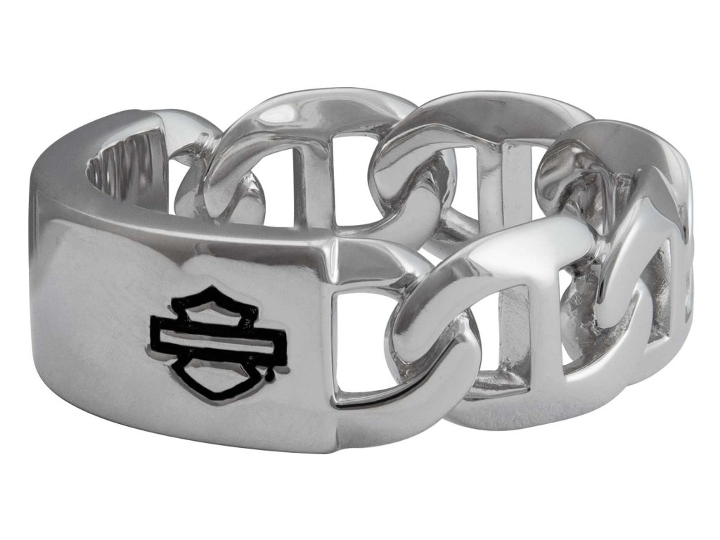 Dámsky oceľový prsteň v tvare reťaze a s kontrastným logom Harley-Davidson® s enamelovou čiernou výplňou. Prsteň je balený v ozdobnej krabičke. materiál: nehrdzavejúca oceľ, enamel