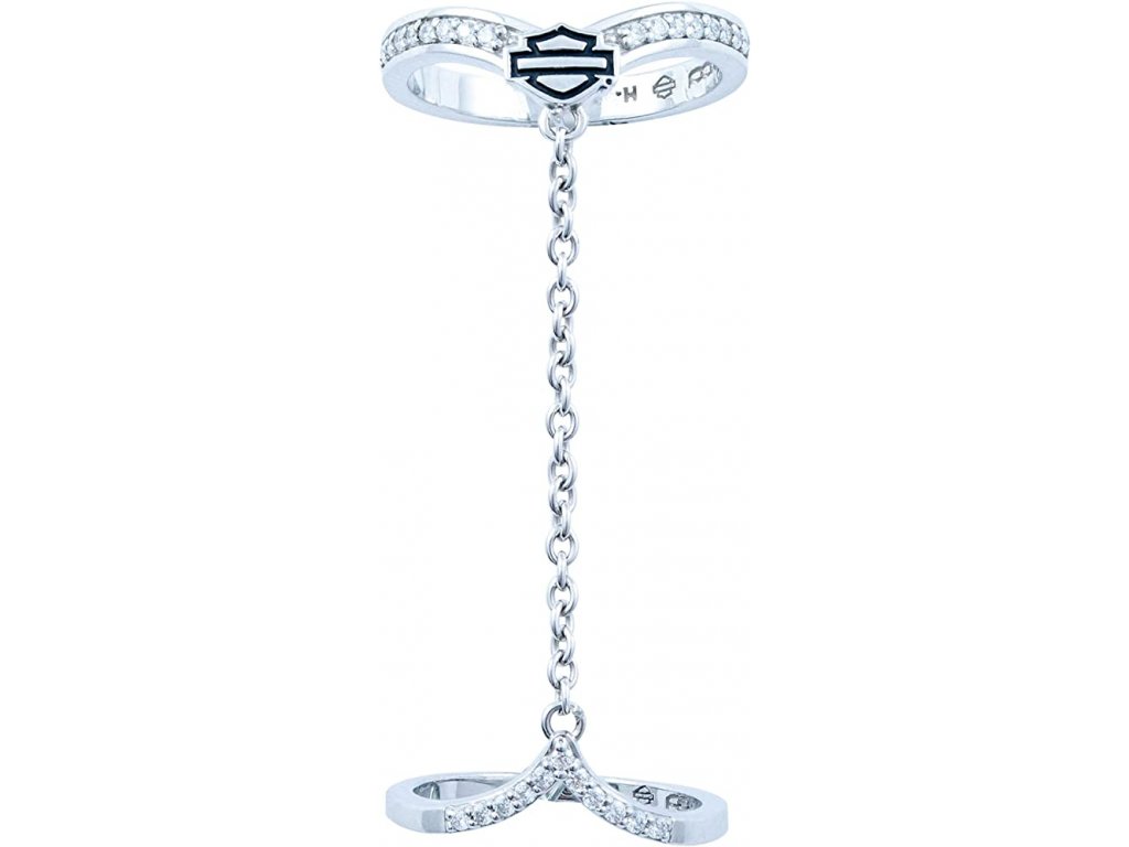 Strieborné dámske prstene s logom Harley-Davidson® a zdobené kryštálikmi, spojeté retiezkou. Prsteň je balený v ozdobnej krabičke. Materiál: Sterling striebro. Výrobca: MOD Jewelry®Dodatočné parametre