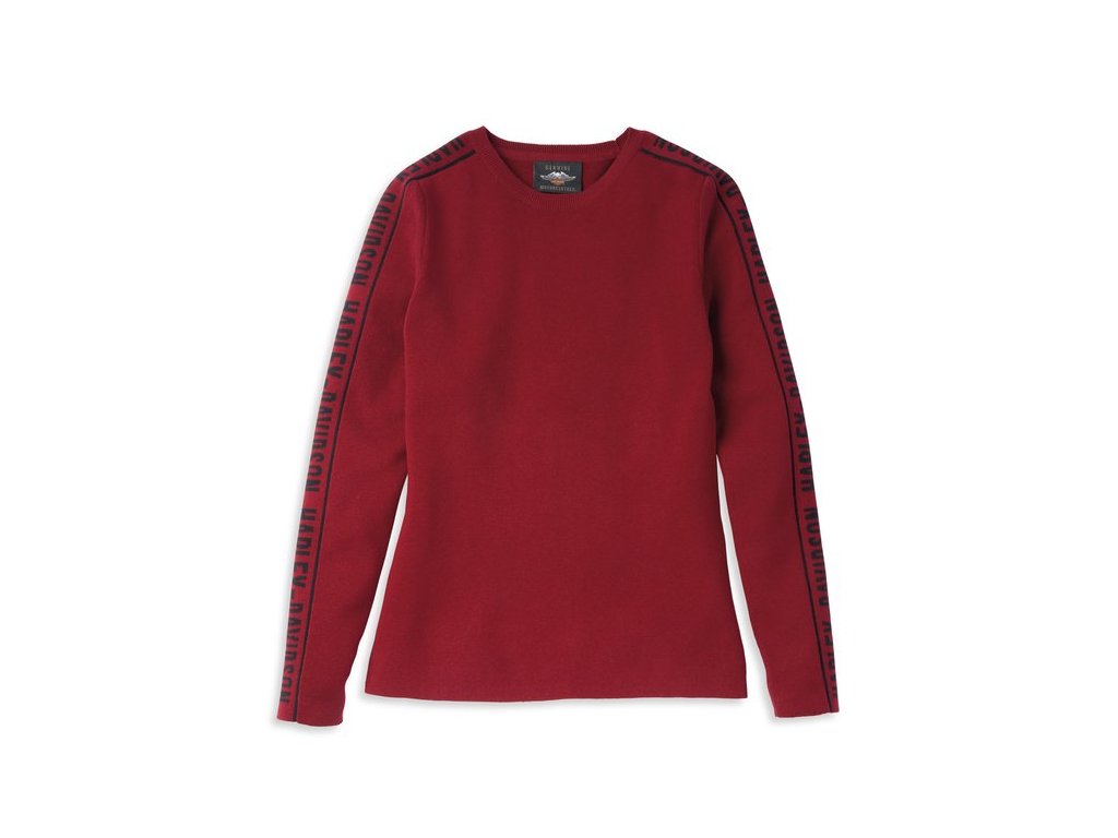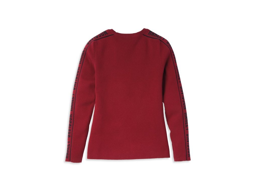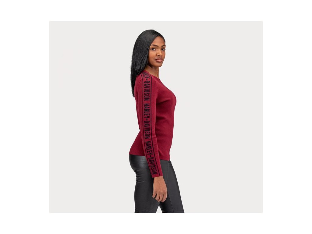 Dámsky pulóver s vypletaným kontrastným nápisom Harley-Davidson® pozdĺž oboch rukávom. farba: červená vínová, materiál: 75% bavlna, 22% nylon, 3% spandex jacquard