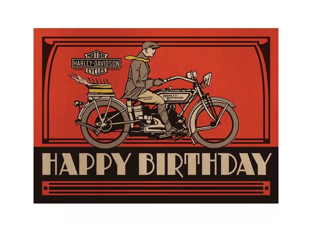 Darčeková kartička k narodeninám z tvrdšieho pohľadnicového papiera Harley-Davidson®. S nápisom vo vnútri: Sending You Miles Of Birthday Wishes! (Posielam ti kilometre prianí k narodeninám!) Materiál: pohľadnicový papier Rozmer kartičky: 18,5 x 13,5 cm Vrátane obálky.Diskusia