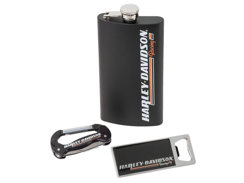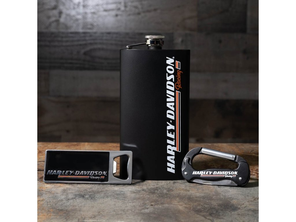 Darčeková sada na mieru pre mužov. Obsahuje 237 ml nerezovú fľašu s lievikom, otvárač na fľaše s vlastným nástrojom a multifunkčný nástroj s karabínkou. Funkcia multifunkčného nástroja zahŕňa karabínu, LED svetlo, zúbkovaný nôž a vreckový nôž. Grafika Harley-Davidson® Racing na všetkých dieloch. Len ručné umývanie. Rozmery fľaše: 9,4 cm Š x 16,7 cm V x 2,5 cm Materiál: nerezBuďte prvý, kto napíše príspevok k tejto položke.