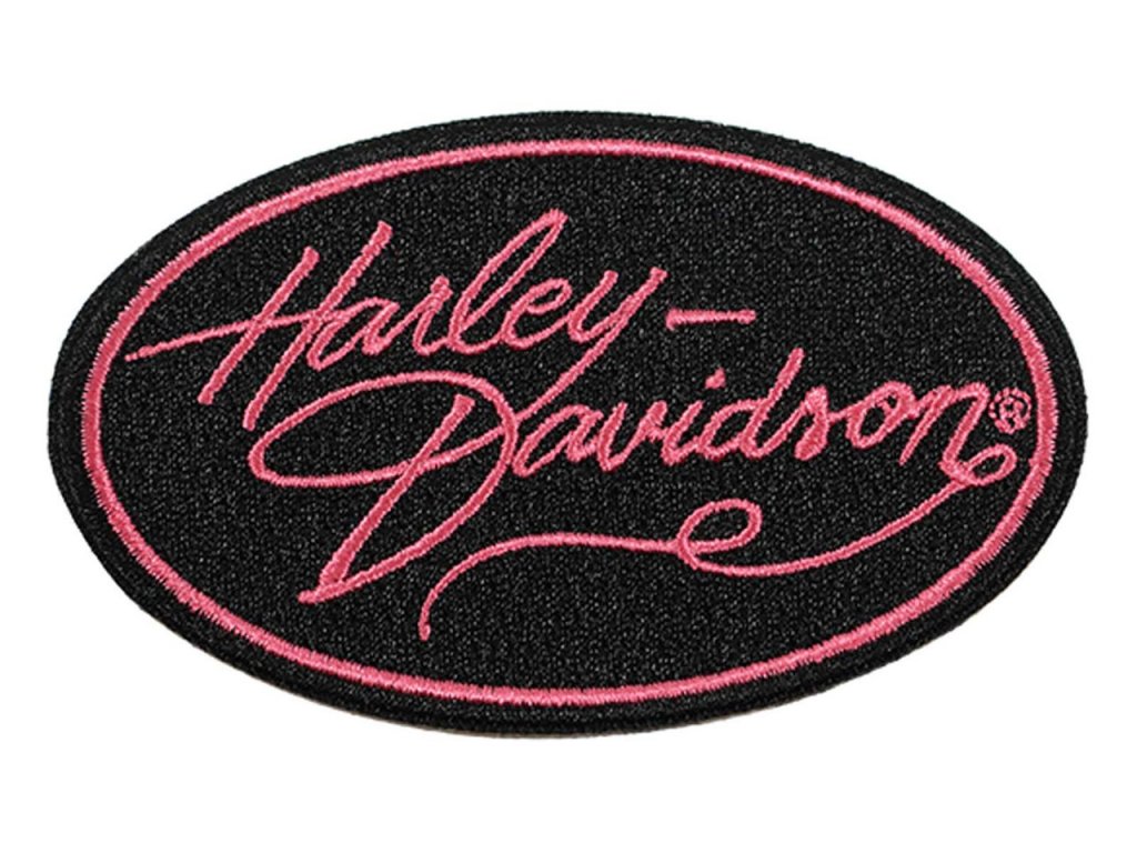 Oválna textilná nášivka s vyšívaným nápisom Harley-Davidson® Materiál: textil, farba: čierna ružová, Rozmery: 8,89 cm x 5,08