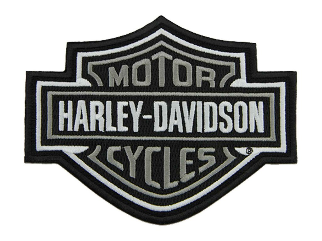 Vyšívaná textilná nášivka v tvare loga Bar & Shield Harley-Davidson®. Materiál: textil, farba: sivá, Rozmery: 14,22 cm x 11,6 cm