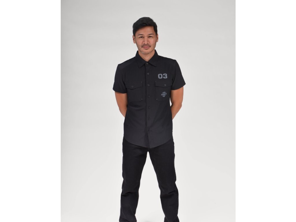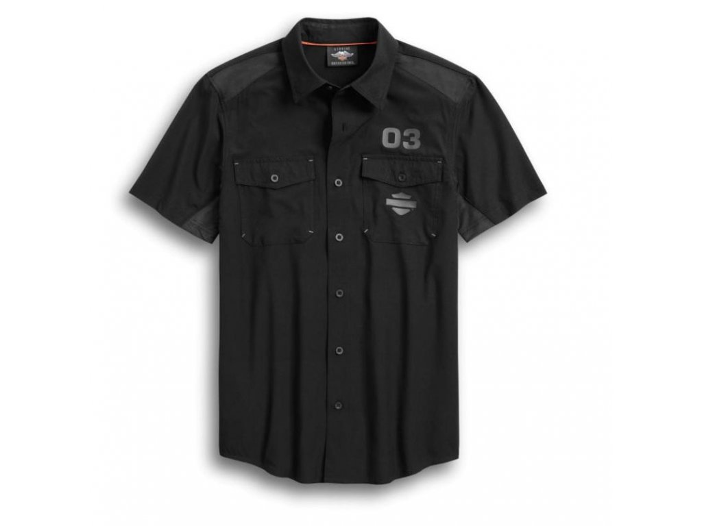 Pánska funkčná košeľa s krátkymi rukávmi s náprsnými vreckami s záklopkami. Sieťované panely pod rukávmi a na ramenách a otvor pozdĺž chrbta zabezpečia odvetrávanie a odvádzanie nadmernej vlhkosti. Funkcia - Stay Cool. Zapínanie na kovové gombíky, aj na náprsných vreckách. Potlačené Bar&Shield logo Harley-Davidson® na ľavom náprsnom vrecku a nápis Harley-Davidson® na chrbte. Farba: čierna Materiál: 92% polyester, 8% spandex ripstopDiskusia