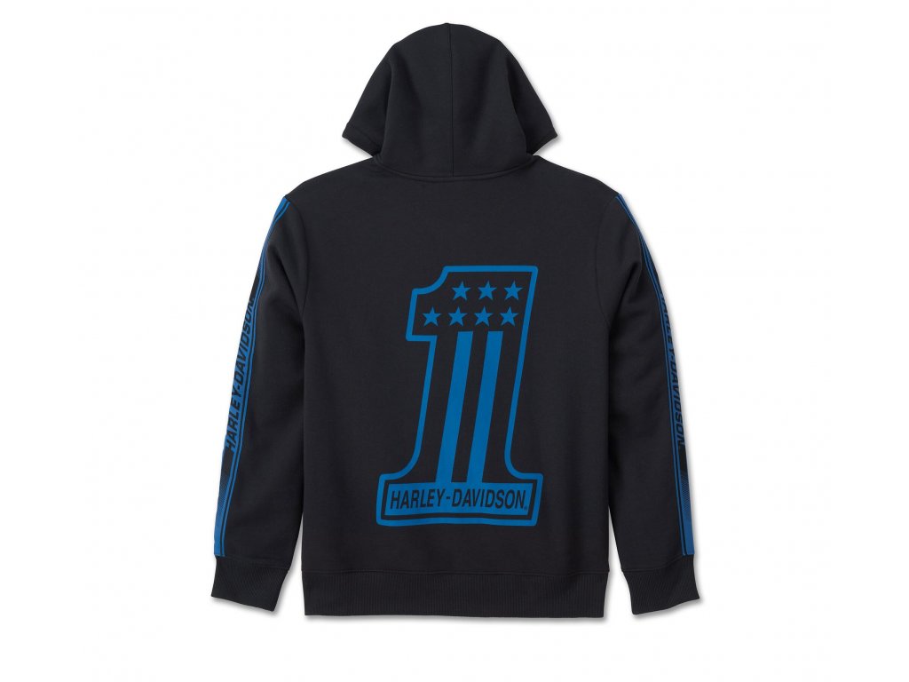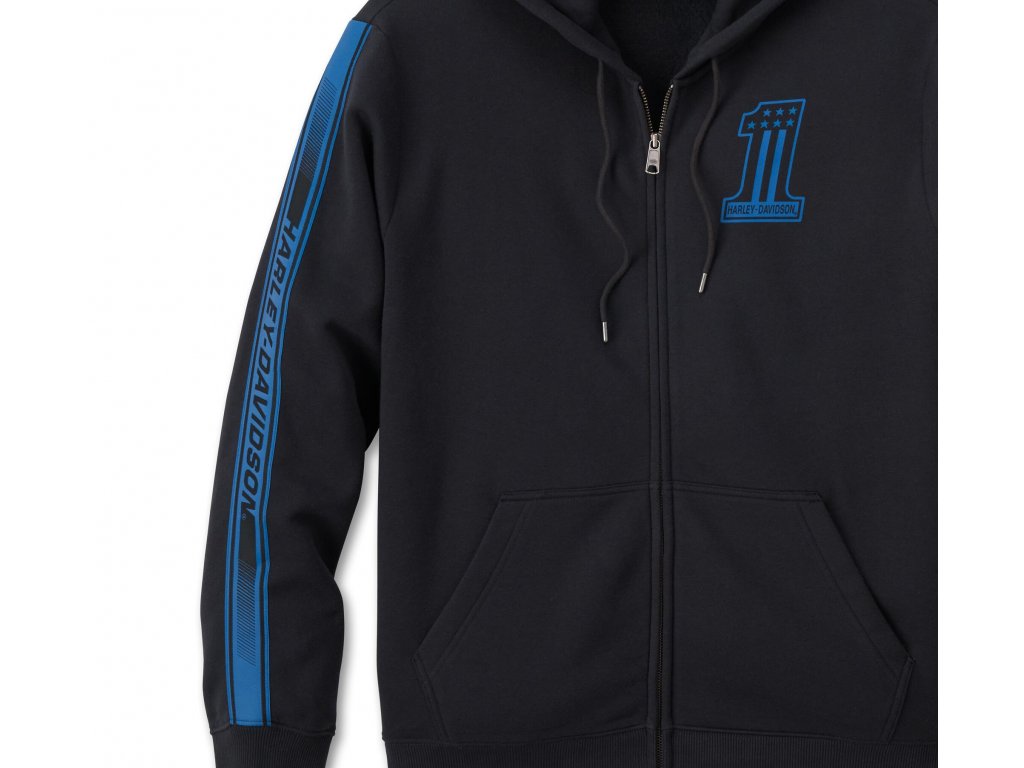 Pánska mikina s kapucňou a so zapínaním na kovový zips. Veľký potlačený nápis Harley-Davidson® pozdĺž oboch rukávov a logo No.1 Harley-Davidson® je potlačené vpredu na ľavej strane. Kolokankové vrecká bez zapínania. Farba: čierna, Materiál: 60% bavlna, 40% polyester fleeseDodatočné parametre