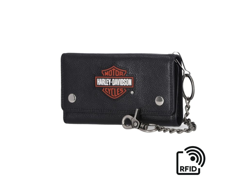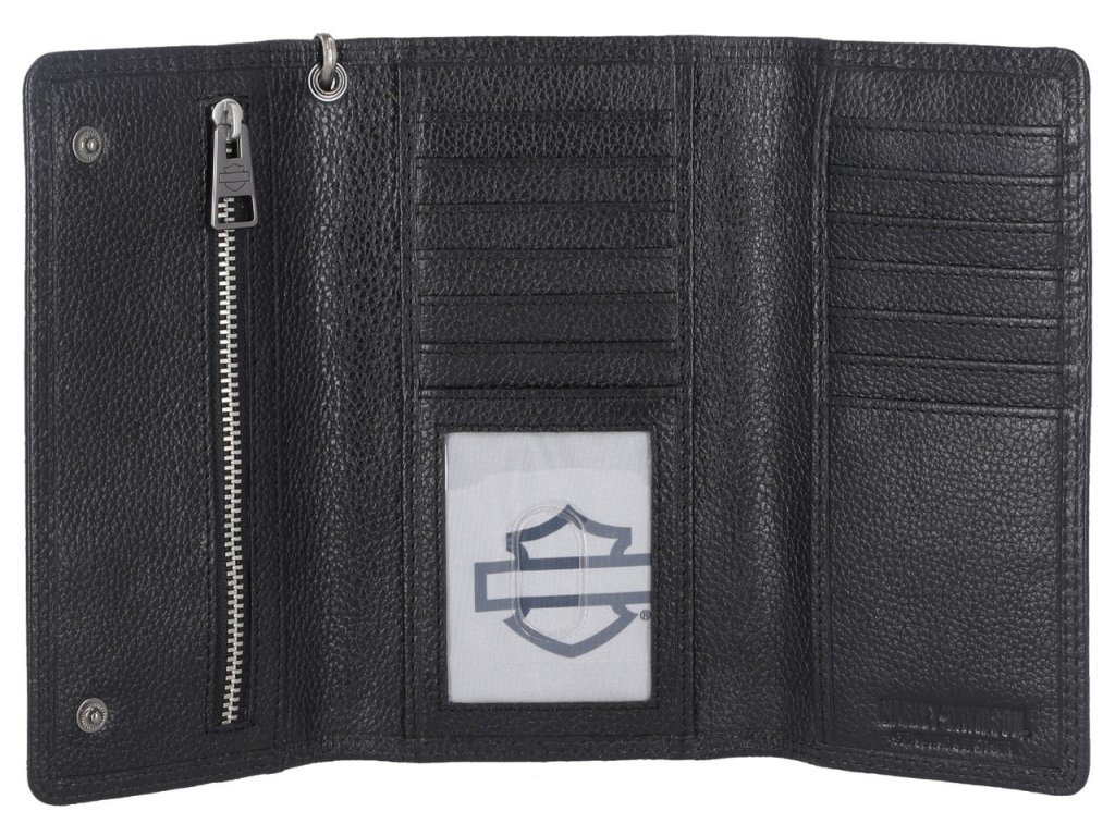 Pánska čierna peňaženka Harley-Davidson® Bar & Shield s trojitým skladaním a reťazou. Túto elegantnú peňaženku zdobí gumové logo a má zapínanie na patentné cvoky. Vnútorné prvky: 11 priehradiek na karty, okienko na preukaz totožnosti, vrecko na zips a vnútorné vrecko na hotovosť. Odnímateľná retiazka. Ochrana RFID, ktorá bráni hackerom v čítaní vašich informácií z peňaženky. Veľkosť 18 x 10 cm. Materiál: koža, kov.Buďte prvý, kto napíše príspevok k tejto položke.