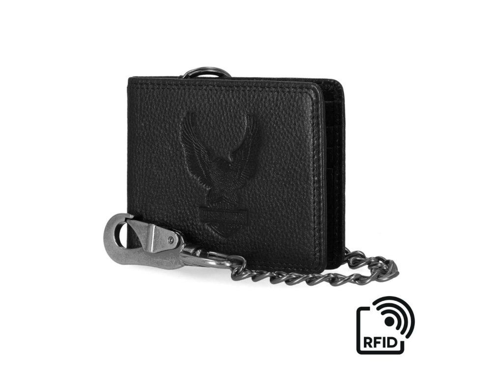 Pánska čierna kožená peňaženka Harley-Davidson® Embossed Eagle s dvojitým skladaním a reťazou. Vyrobená z vysoko kvalitnej pravej kože. Tieto dlhotrvajúce peňaženky sú vyrobené z tých najlepších materiálov. Má logo vyrazené priamym teplom. Odnímateľná motorkárska retiazka s odolnou matnou bronzovou povrchovou úpravou. Vnútorné prvky: 3 priehradky na kreditné karty, okienko na preukaz totožnosti a priehradka na hotovosť. Ochrana RFID, ktorá bráni hackerom v čítaní vašich informácií z peňaženky. Rozmery: 10,7 cm x 9,5 cm. Materiál: koža, kov.Buďte prvý, kto napíše príspevok k tejto položke.
