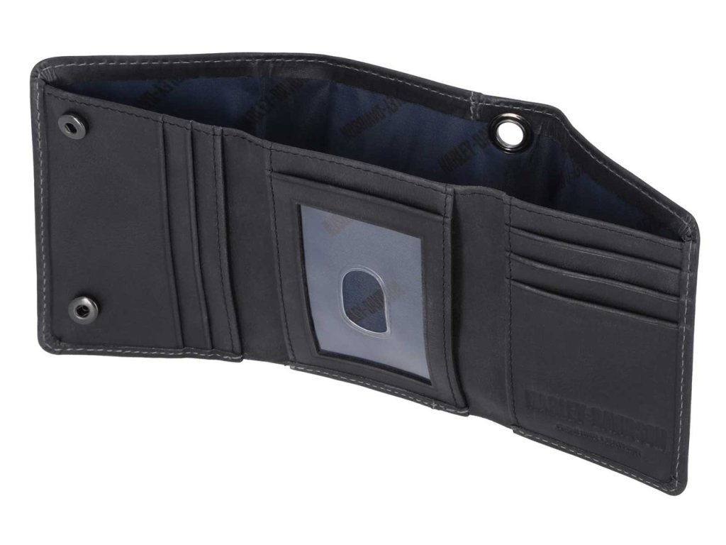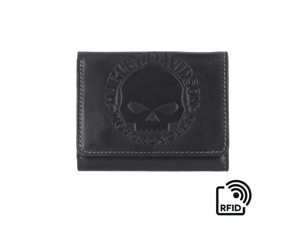 Pánska čierna kožená peňaženka Harley-Davidson® Willie G. Skull s trojitým skladaním. Vyrobená z pravej kože. Vnútorné prvky: okienko na preukaz totožnosti, priehradky na karty a priehradky na hotovosť. Zapínanie na patentný cvok v bronzovom prevedení. Vonkajšie zadné vrecko. Kovové očko na pripevnenie retiazky, retiazka nie je súčasťou balenia. Ochrana RFID, ktorá bráni hackerom v čítaní vašich informácií z peňaženky. Rozmery: 10,7 cm x 9,4 cm. Materiál: koža, kov.Buďte prvý, kto napíše príspevok k tejto položke.