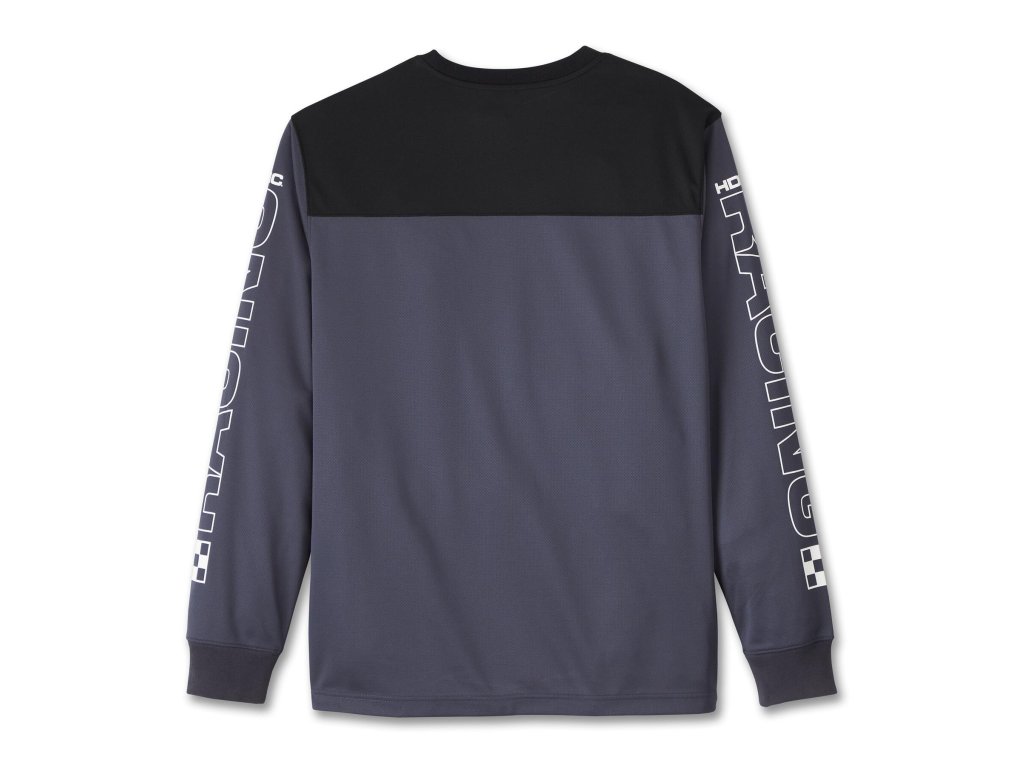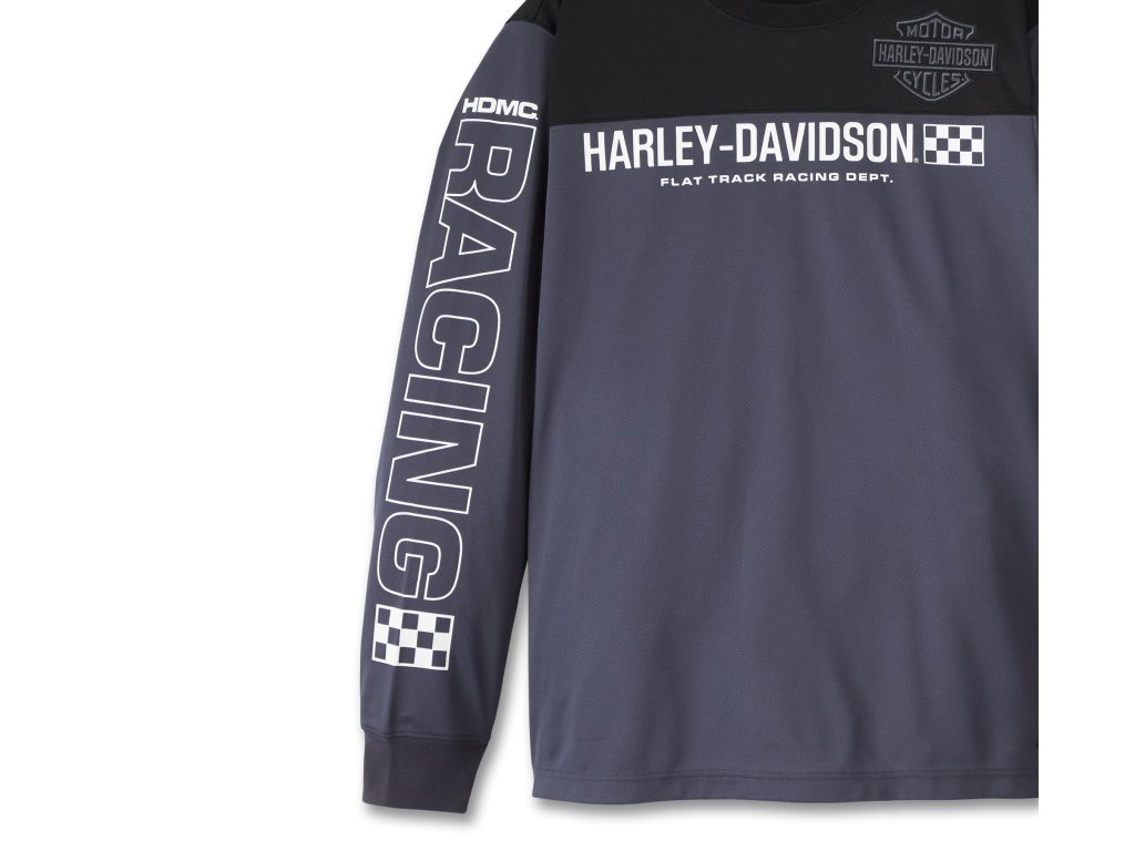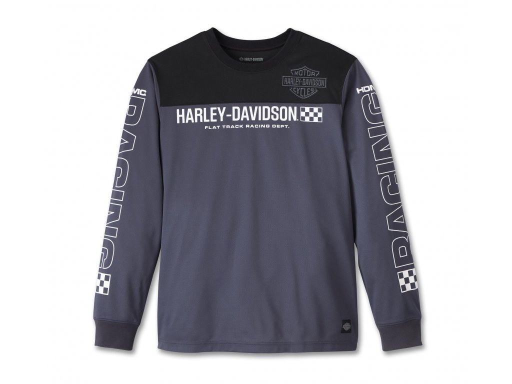 Pánske funkčné tričko s dlhými rukávmi z funkčnej hustej sieťoviny, vďaka ktorej bude nadbytočná vlhkosť odvedená do priestoru. Grafika Harley-Davidson® Racing potlačená vpredu a pozdĺž oboch rukávov. Materiál: 100% polyesterová sieťovinaDodatočné parametre