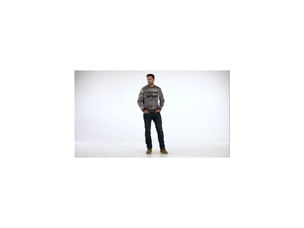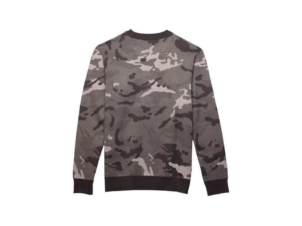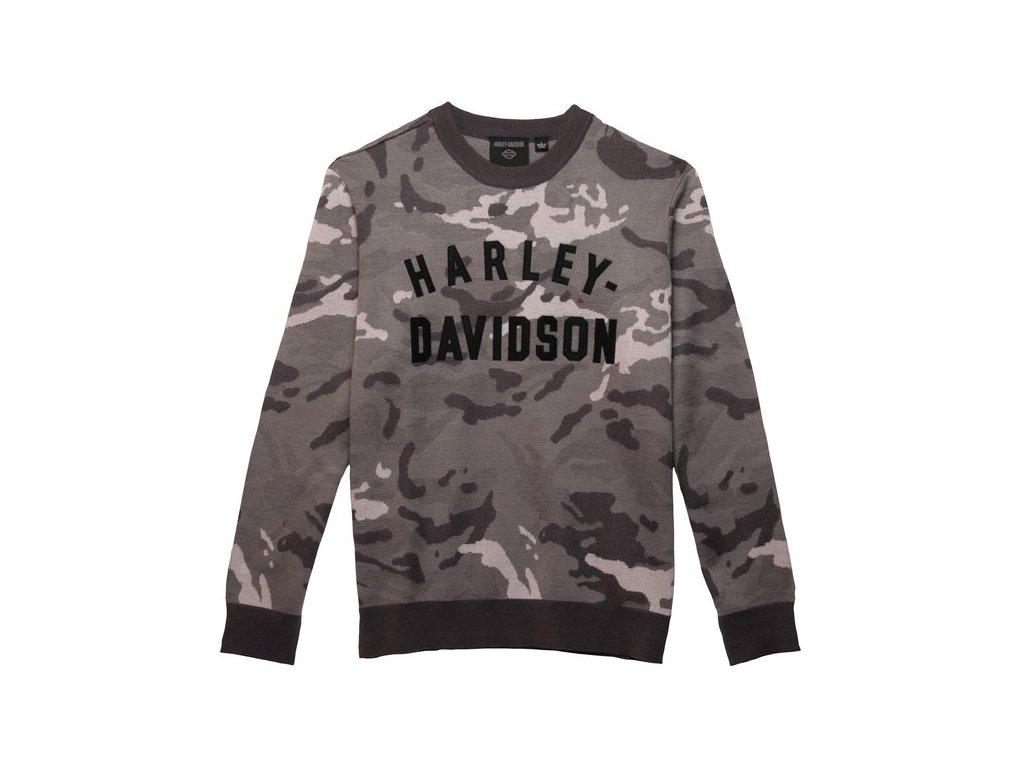Pánsky úpletový pulóver s veľkým vpletaným nápisom Harley-Davidson® vpredu na hrudi. Farba: Burgundy Camouflage Materiál: 70% acryl, 30% vlna intarsia