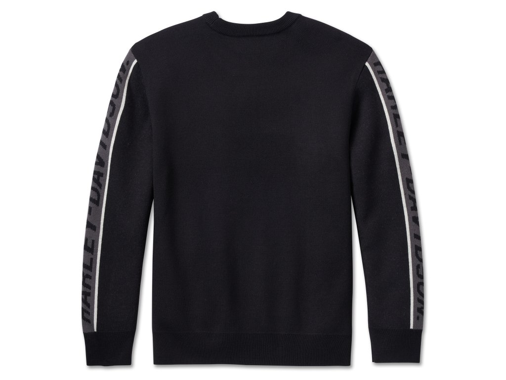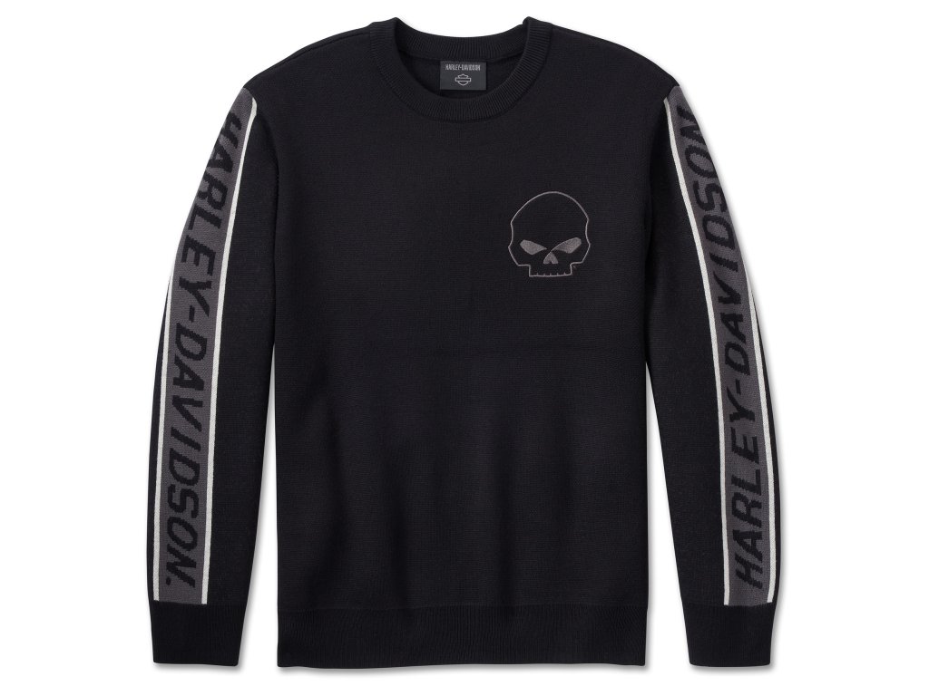 Pánsky úpletový pulóver s veľkým vpletaným nápisom Harley-Davidson® na rukávoch a logom Willie G® Skull vyšitým vpredu na hrudi. Farba: čierna Materiál: 70% acryl, 30% vlna