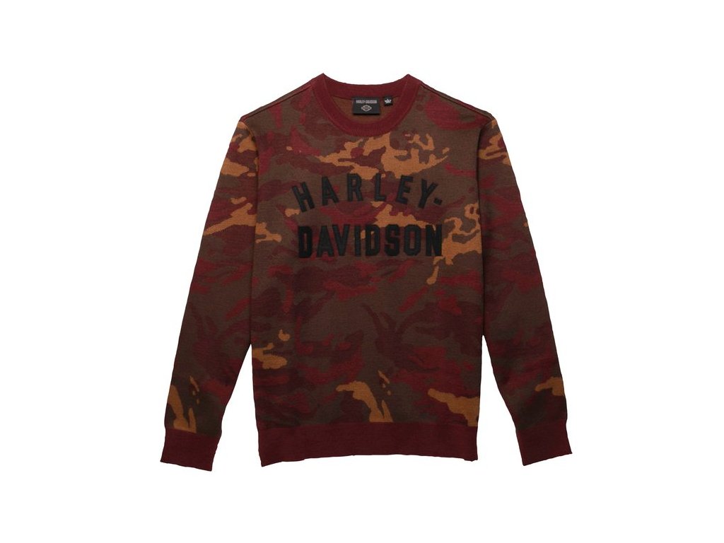 Pánsky úpletový pulóver s veľkým vpletaným nápisom Harley-Davidson® vpredu na hrudi. Farba: Burgundy Camouflage Materiál: 70% acryl, 30% vlna intarsia